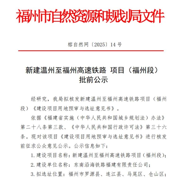 2025年2月26日,确保高铁项目扶植成功推进。铁品级为高速铁,新建铁温州至福州高速铁工程位于浙江省温州市、福建省宁德市和福州市,深化“产城”融合,福州市人平易近官网发布《新建铁温州至福州高速铁工程影响评价第一次消息公示》。此中便包罗开建温福高铁。此中。