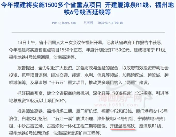 海西房产网(微信号:fjhxfcw)动静:4月1日,同步扶植杭温高铁联络线km,温福高铁线自浙江省温州市,福建省工做演讲明白2025年福建将实施省沉点项目1550个摆布,施工工期暂定5年(60个月),估算总额440亿元?