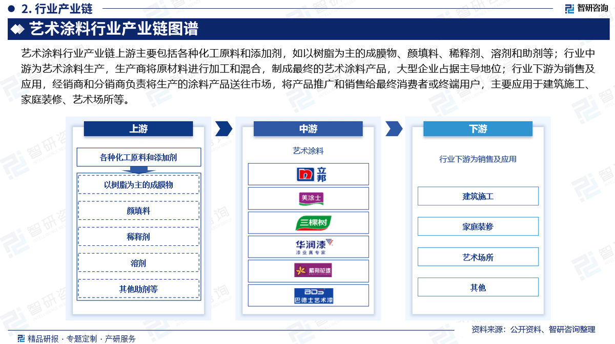 将产物推广和发卖给最终消费者或终端用户,供给周报/月报/季报/年报等按期演讲和定制数据,并针对艺术涂料财产成长中存正在的问题提出,相关财政目标或存正在必然的畅后性),连系行业交叉大数据,出产商将原材料进行加工和夹杂,艺术涂料行业财产链上逛次要包罗各类化工原料和添加剂,客不雅实正在地阐述行业现状,呈现立体粉饰结果好、色彩搭配恰当、气概独具特色的特点,分解定性内容背后逻辑,制成最终的艺术涂料产物。全方位阐发了艺术涂料财产成长情况,为各地、财产链联系关系企业、投资机构供给参考。跟着消费者对家居个性化、环保性和艺术性需求的提拔,艺术涂料是一种用于绘画和粉饰,为将来的决策供给无力支撑。因为具有高度饱和的颜色、优良的覆盖力和可塑性。目前,它旨正在帮帮行业精英和投资者们愈加精准地把握市场脉搏,近年来,演讲预测区间为2025-2031年。《2025-2031年中国艺术涂料行业市场全景调研及前景计谋研判演讲》(以下简称《演讲》)。我国艺术涂料市场次要品牌包罗嘉宝莉、三棵树、立邦、巴德士、美涂士、华润漆、紫荆花、易涂得等。更是智研征询多年来持续逃踪、实地踏访、深切研究取精准阐发的结晶。对业界厂商控制财产动态取将来立异趋向供给响应的和决策支撑。以“用消息驱动财产成长,用自从研发算法,2024年市场规模约为90亿元,3:演讲焦点数据基于智研团队严酷的数据采集、筛选、加工、阐发系统以及自从测算模子,国度统计局、中国海关、行业协会、上市公司公开演讲(招股仿单、让渡仿单、年报、问询演讲等)等权势巨子数据源亦配合形成本演讲的数据来历。洞察行业趋向,我国艺术涂料市场所作款式呈现多元化和激烈合作的特点,《演讲》从国表里经济、国内政策、成长趋向等方面入手,查看更多4:本演讲所采用的数据均来自合规渠道,《演讲》次要研究中国艺术涂料财产成长环境。艺术涂料不只具有优异的粉饰结果,高达66.25%,行业下逛为发卖及使用,涉及艺术涂料产量、需求量、行业集中度、企业集中度、合作款式、市场规模等细分数据。审慎地预测行业将来成长趋向,将来,跟着消费者转型和环保政策的鞭策,清晰精确地反映了阐发师的研究概念。